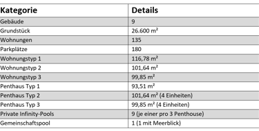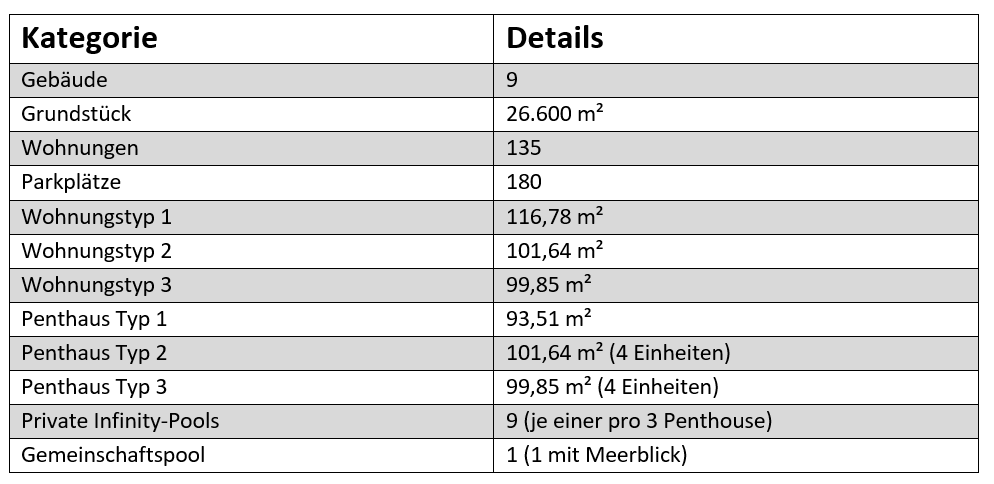 Die Anlage umfasst 9 elegante Gebäude und 19 Villas mit großzügigen Wohn- und Parkflächen.